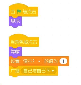 当角色被点击时 隐藏 设置演示模式为1 广播"广播消息"(通知其他角色进入演示模式)当绿旗被点击时 显示