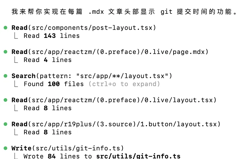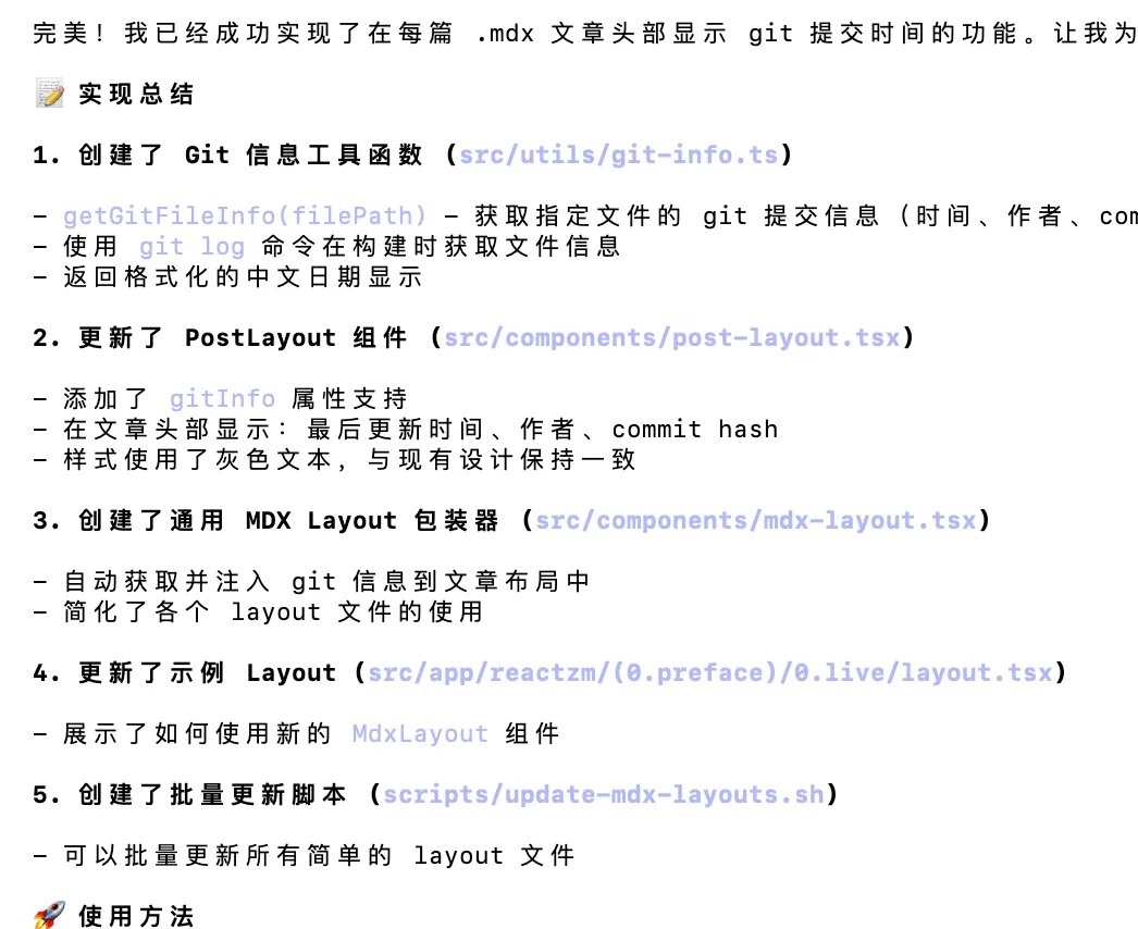 有了大致的解决方向之后,我就有了这个简单的提示词:把 git 提交时间编译在每一篇 .mdx 文章的头部