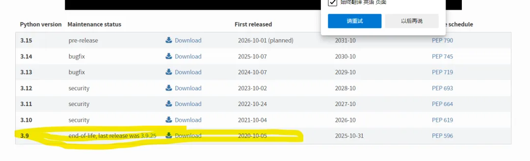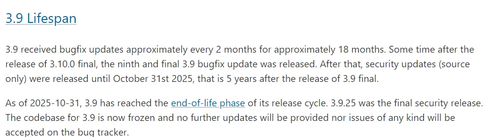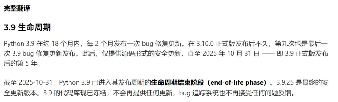 这也是我一直执着于下载Python3.9.25版本的最主要原因,另外一个原因就是Python3.9.25是Python3.9系列版本中补丁最全的一个版本,可以减少后期使用该Python的一些麻烦。