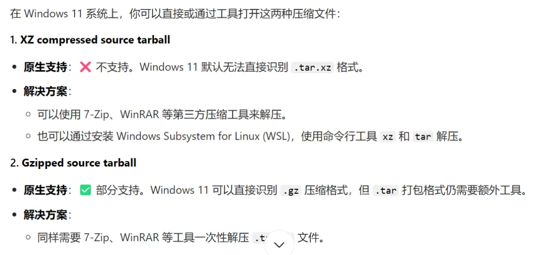 这块我用豆包查过资料,这两个文件选第一个就行“Gzipped source tarball”,这个文件用windows下的winzip和7Z都能打开,而另一个“XZ compressed source tarball”文件我没尝试,根据豆包的说法是文件会打不开。