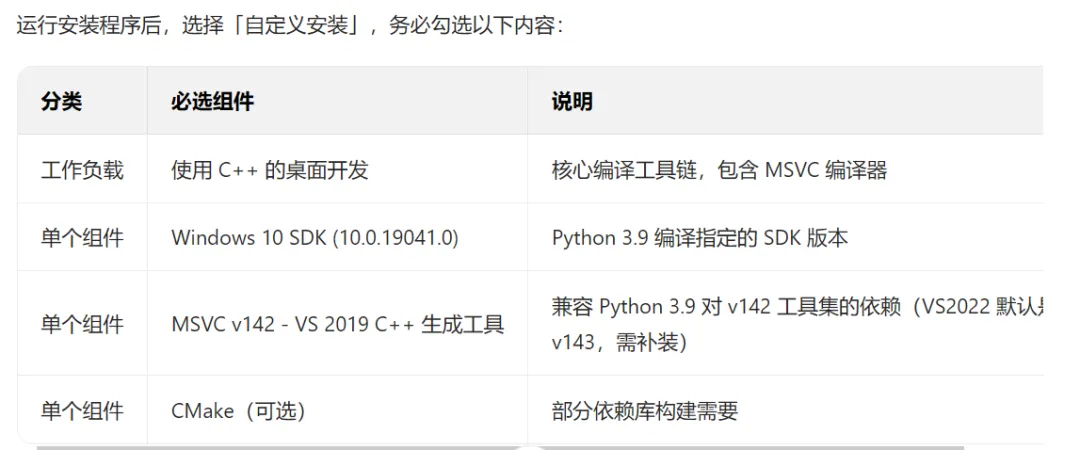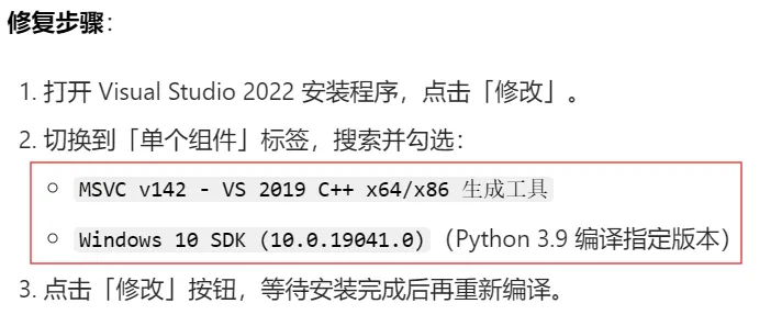 Python 3.9 默认找 VS2019 的 v142 工具集,需手动指定工具集版本,执行以下命令: