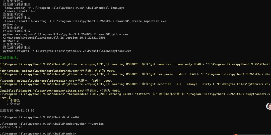 cmd命令行: # 进入源码目录(替换为你的解压路径) cd D:\python-3.9.25 # 下载编译所需的外部依赖(xz、zlib 等) .\PCbuild\get_externals.bat |
