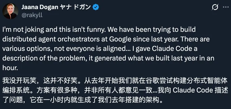 Google首席工程师Jaana Dogan发了一条推文,大意是她让Claude Code处理一个问题,结果它在一小时内生成了她团队花一年时间才完成的东西。这条推文获得了超过800万次浏览。