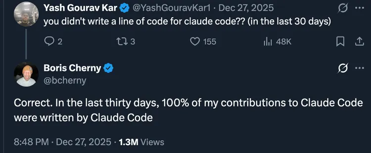 但最让人震惊的是Claude Code创造者Boris Cherny自己说的话。他在推特上公布了一个数据:30天内,他对Claude Code代码库的所有贡献,100%都是由Claude Code自己编写的。4万行新代码,259个PR,全部出自AI之手。