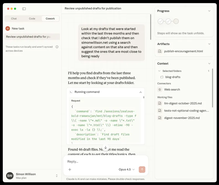 Simon Willison自己也做了个实验。他没让Claude写代码,让它检索自己博客三个月内的草稿,确认哪些还没发布过,然后推荐最接近完成的几篇。Claude执行了44次独立搜索,最后给出了排序建议。