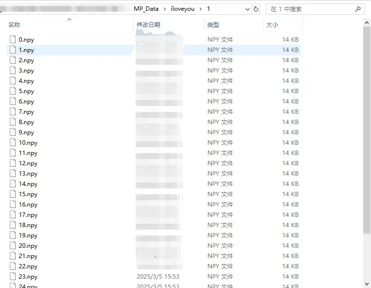 这些识别出的关键点数据被存储在名为 MP_Data 的文件夹中,每个序列的数据均以 .npy 格式保存在其对应的子文件夹内。这种存储方式不仅便于数据的管理和检索,也有利于后续模型训练过程中的数据加载与处理。通过这种方式,能够确保数据的完整性和可用性,为构建高效准确的手语识别模型奠定坚实的数据基础。
