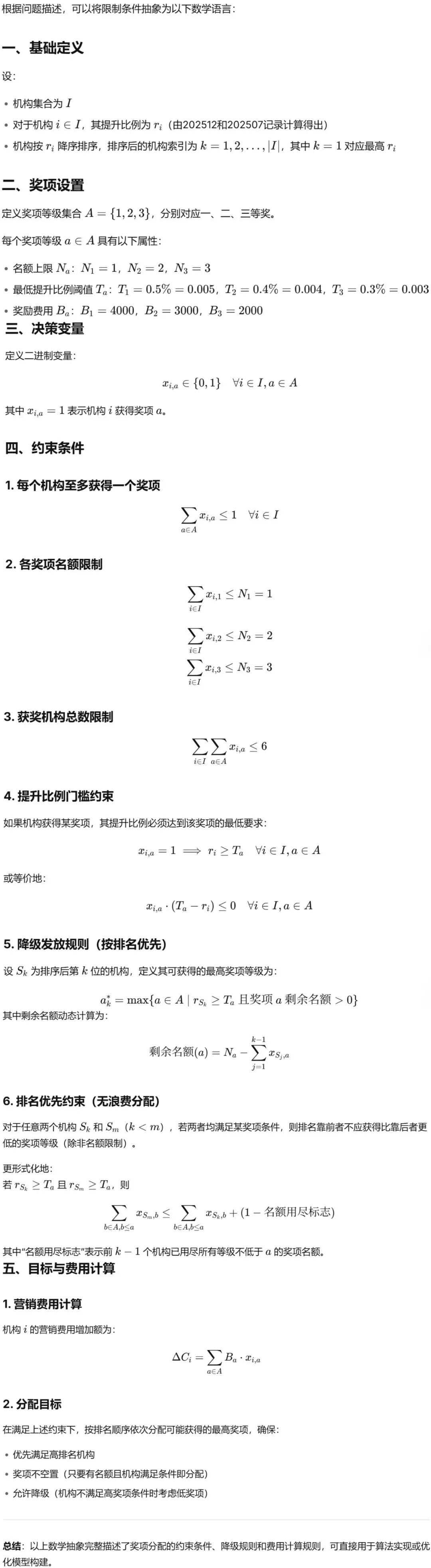 对于每个机构,脚本从一等奖开始依次检查其提升比例是否达到该奖项的最低阈值,并在名额可用时分配相应的营销费用;若不符合当前奖项条件,则逐级向下检查,直至可能获得符合条件的奖项或一无所获。