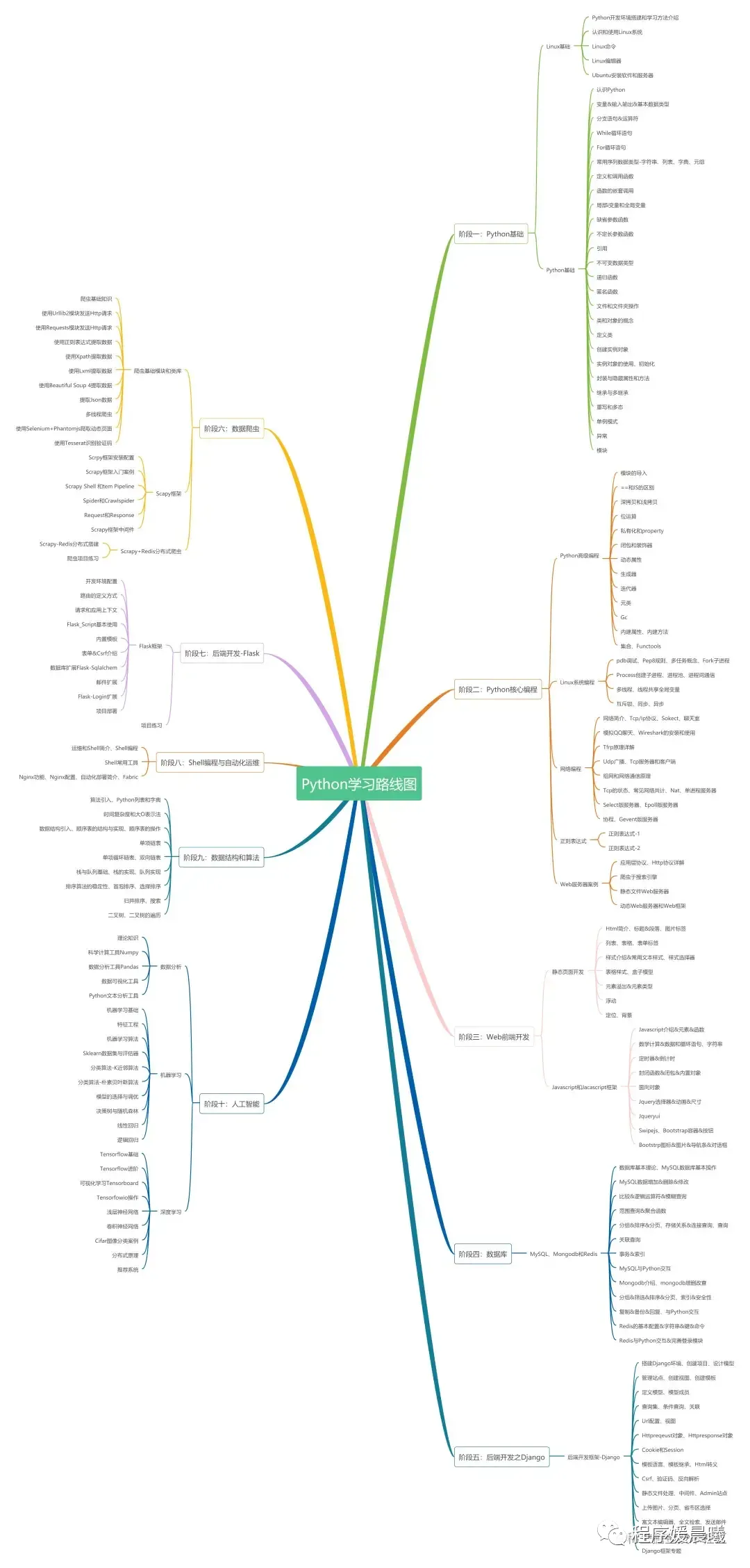 这里,我给大家总结了一份超全Python学习路线图,共包括10个阶段,从基础到核心、从开发到爬虫、从自动化运维到数据分析,一份帮你搞定。