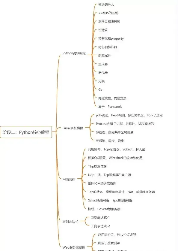 基础打完之后,接下来就学习Python编程,包括Python高级编程、Linux系统编程、网络编程、正则表达式和Web服务器案例。