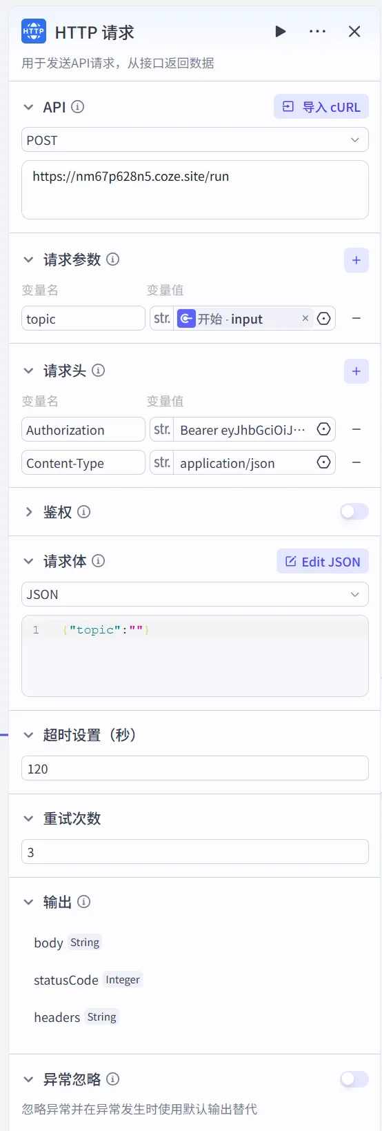 最近扣子更新了扣子编程,小伙伴们生成的工作流如何被调用呢,今天用一个非常简单的样例给大家做个演示。1.1 点击管理apitoken,生成apikey,用于第2步参数的填写。1.2 注意上图红线位置的内容,与第2步参数的对应关系,仔细一点即可。2. 如下图是用扣子http节点调用上述工作流的界面注意2:Bearer 和 apikey的值之间,有一个英文的半角空格。