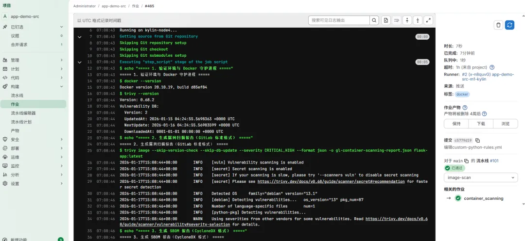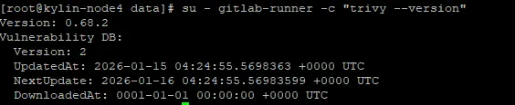# 下载 trivy 命令并安装curl -sfL https://raw.githubusercontent.com/aquasecurity/trivy/main/contrib/install.sh | sh -s -- -b /usr/local/binsu - gitlab-runner -c "trivy --version"# 拉取最新的漏洞库trivy image mirror.gcr.io/aquasec/trivy-db:2