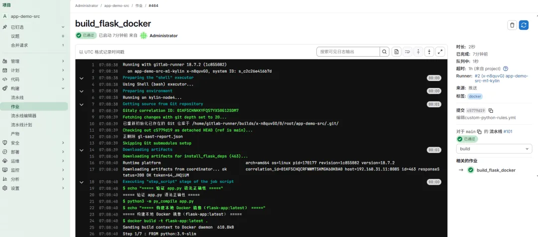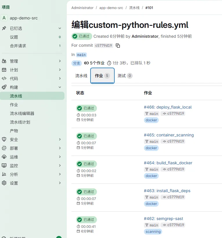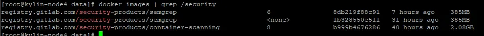 # 提前拉取镜像,避免第一次构建拉取时间过长docker pull registry.gitlab.com/security-products/semgrep:6docker pull registry.gitlab.com/security-products/container-scanning:8docker images #查看拉取情况