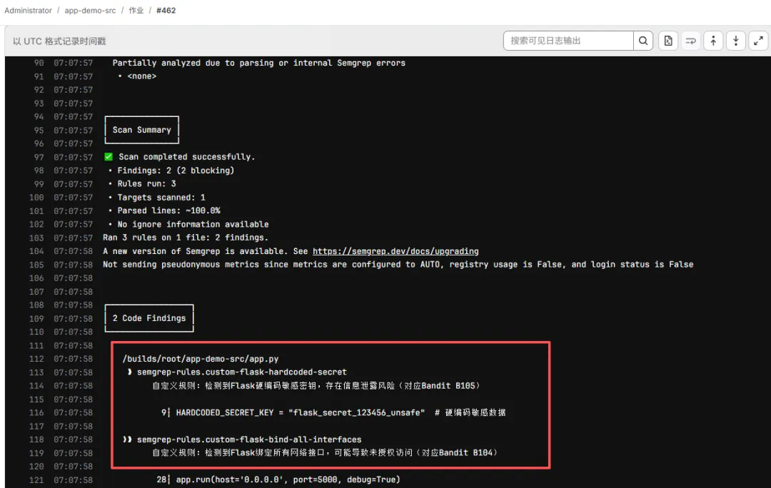 from flask import Flask# 新增:导入request用于获取用户输入(为XSS漏洞做准备)from flask import requestapp = Flask(__name__)# Bug 1:硬编码敏感API密钥(Semgrep高风险漏洞,关键字「secret」「key」触发扫描)# 符合Semgrep内置规则 python.security.secrets.hardcoded-api-keyHARDCODED_SECRET_KEY = "flask_secret_123456_unsafe" # 硬编码敏感数据app.config['SECRET_KEY'] = HARDCODED_SECRET_KEY # 有效使用,确保Semgrep能识别@app.route('/')def hello(): # 后续测试可修改此内容,验证流程闭环 return "Hello Flask! 容器部署成功~ v2 "@app.route('/greet')def greet(): user_name = request.args.get('name', 'Guest') return f"Hello, {user_name}! 欢迎访问~" if __name__ == '__main__': # Bug 2:Flask开启调试模式(Semgrep中风险漏洞) # 符合Semgrep内置规则 python.flask.security.debug-mode.enabled app.run(host='0.0.0.0', port=5000, debug=True)