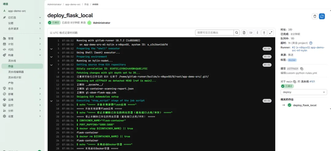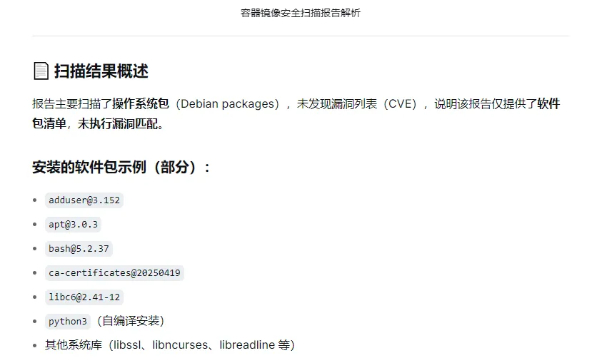 # ======================================================# GitLab CI/CD 配置文件# 用途:Python Flask应用的安全扫描与部署流水线# 包含阶段:代码扫描 → 依赖安装 → 镜像构建 → 镜像扫描 → 部署# ======================================================# ==================== 模板引入 ====================# 引入GitLab官方安全扫描模板,简化配置include: # SAST:静态应用安全测试,自动扫描代码中的安全漏洞 - template: Security/SAST.gitlab-ci.yml # 容器扫描:扫描Docker镜像中的安全漏洞 - template: Security/Container-Scanning.gitlab-ci.yml# ==================== 流水线阶段定义 ====================# 定义全流程五个阶段,按顺序执行stages: - code-scan # 阶段1:代码安全扫描(使用Semgrep) - install # 阶段2:安装Python/Flask依赖,验证依赖可用性 - build # 阶段3:验证应用语法,构建Docker镜像 - image-scan # 阶段4:扫描Docker镜像安全漏洞 - deploy # 阶段5:本地停止旧容器,启动新构建的Docker镜像# ==================== 阶段1:代码安全扫描 ====================# 使用GitLab SAST功能进行静态代码安全分析sast: stage: code-scan # 绑定到code-scan阶段 tags: - scanning # 使用带有scanning标签的Runner执行 # SAST扫描配置变量 variables: # 指定使用Semgrep作为默认分析器 SAST_DEFAULT_ANALYZERS: "semgrep" # 使用官方安全规则集:p/security(通用安全)+ p/python(Python专用) SAST_SEMGREP_RULESETS: "p/security,p/python" # 排除不需要扫描的目录 SAST_EXCLUDED_PATHS: "vendor/, node_modules/, .git/" # 引入自定义Semgrep规则文件(关键:增强扫描能力) SAST_SEMGREP_ADDITIONAL_RULES: "./semgrep-rules/custom-python-rules.yml" # 扫描前执行的脚本,主要用于调试和验证 before_script: # 查看项目目录结构,确认文件存在 - echo "=== 列出Docker容器内项目目录文件 ===" - ls -la /builds/root/app-demo-src/ # 确认自定义规则文件存在 - echo "=== 列出semgrep-rules文件夹内文件 ===" - ls -la /builds/root/app-demo-src/semgrep-rules/ # 验证自定义规则文件是否存在 - echo "=== 验证自定义规则文件是否存在 ===" - test -f /builds/root/app-demo-src/semgrep-rules/custom-python-rules.yml && echo "自定义规则文件存在" || echo "自定义规则文件不存在" # 新增:手动执行Semgrep扫描,用于调试和详细日志输出 - echo "=== 手动执行Semgrep原生扫描 ===" - semgrep scan --config /builds/root/app-demo-src/semgrep-rules/custom-python-rules.yml --verbose /builds/root/app-demo-src/app.py# ==================== 阶段2:安装依赖 ====================# 安装Python和Flask项目所需的依赖包install_flask_deps: stage: install # 绑定到install阶段 tags: - docker # 使用带有docker标签的Runner执行 # 缓存配置:缓存pip下载的包,提升后续运行效率 cache: paths: - ~/.cache/pip/ # 主要执行脚本 script: # 升级pip到最新版本 - echo "===== 开始升级pip =====" - pip3 install --upgrade pip --user # 安装requirements.txt中指定的所有依赖 - echo "===== 开始安装Flask项目依赖 =====" - pip3 install --no-cache-dir -r requirements.txt --user # 验证Flask依赖是否安装成功 - echo "===== 验证依赖安装结果 =====" - python3 -c "import flask; print('Flask依赖安装成功,版本:', flask.__version__)" # 工件(artifacts)配置:保存安装成功的依赖信息 artifacts: paths: - requirements.txt # 保存依赖列表文件 when: on_success # 仅当任务成功时保存 expire_in: 1 hour # 工件保存1小时后过期# ==================== 阶段3:构建镜像 ====================# 构建应用的Docker镜像build_flask_docker: stage: build # 绑定到build阶段 tags: [docker] # 使用带有docker标签的Runner执行 dependencies: [install_flask_deps] # 依赖install_flask_deps阶段成功完成 script: # 验证Python代码语法正确性 - echo "===== 验证 app.py 语法正确性 =====" - python3 -m py_compile app.py # 语法检查,报错则终止CI # 构建Docker镜像并标记为latest - echo "===== 构建本地 Docker 镜像(flask-app:latest) =====" - docker build -t flask-app:latest . # 查看构建成功的镜像信息 - echo "===== 本地镜像构建成功,查看镜像信息 =====" - docker images | grep flask-app # 打印本地镜像信息 # 不允许失败:如果构建失败,整个流水线应该停止 allow_failure: false# ==================== 阶段4:镜像安全扫描 ====================# 使用Trivy扫描Docker镜像中的安全漏洞container_scanning: stage: image-scan # 绑定到image-scan阶段 tags: [docker] # 使用带有docker标签的Runner执行 dependencies: [build_flask_docker] # 依赖build_flask_docker阶段成功完成 # 不允许失败:如果扫描失败,整个流水线应该停止 allow_failure: false script: # 验证环境工具版本 - echo "===== 1. 验证环境与 Docker 守护进程 =====" - docker --version # 验证Docker客户端可用 - trivy --version # 验证Trivy工具可用 # 执行容器安全扫描,生成GitLab标准格式的JSON报告 - echo "===== 2. 生成漏洞扫描报告(GitLab 标准格式) =====" - trivy image --skip-version-check --skip-db-update --severity CRITICAL,HIGH --format json -o gl-container-scanning-report.json flask-app:latest # 生成软件物料清单(SBOM),CycloneDX格式 - echo "===== 3. 生成 SBOM 报告(CycloneDX 格式) =====" - trivy image --skip-version-check --skip-db-update --format cyclonedx -o gl-sbom-flask-app.cdx flask-app:latest # 验证报告文件已正确生成 - echo "===== 4. 验证报告文件已生成 =====" - ls -l# ==================== 阶段5:部署应用 ====================# 在本地部署Flask应用deploy_flask_local: stage: deploy # 绑定到deploy阶段 tags: [docker] # 使用带有docker标签的Runner执行 dependencies: [build_flask_docker] # 依赖build_flask_docker阶段成功完成 # 限制部署条件:仅在master或main分支执行 only: - main script: # 定义容器配置变量 - 