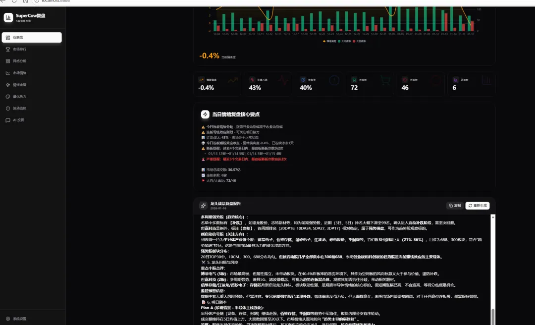 它能干嘛? 部署在我本机的docker上,16点自动准时运行,连之前的点一下都不用了, 新的数据脚本更加健壮,一键秒级更新完全部数据。今天下午更是把复盘智能体的架构都搭出来了,内容附在了文章最后,后面有人看的话可能每天发一发