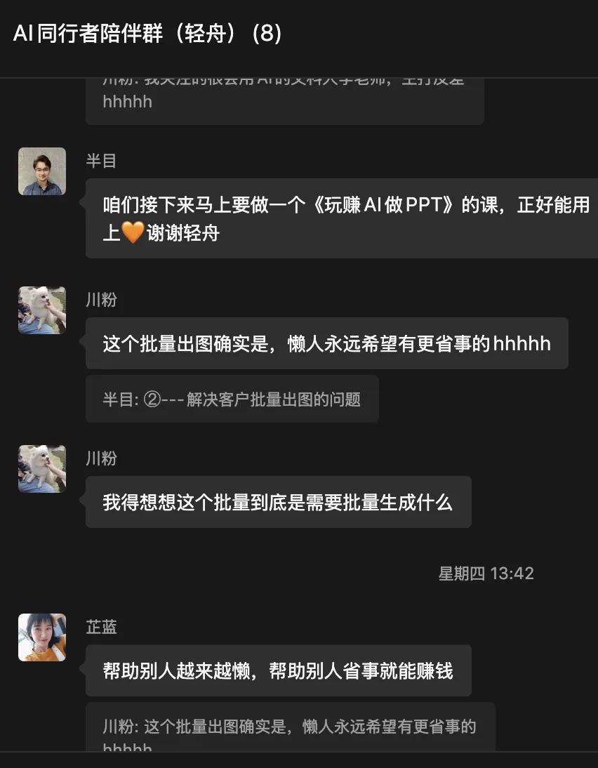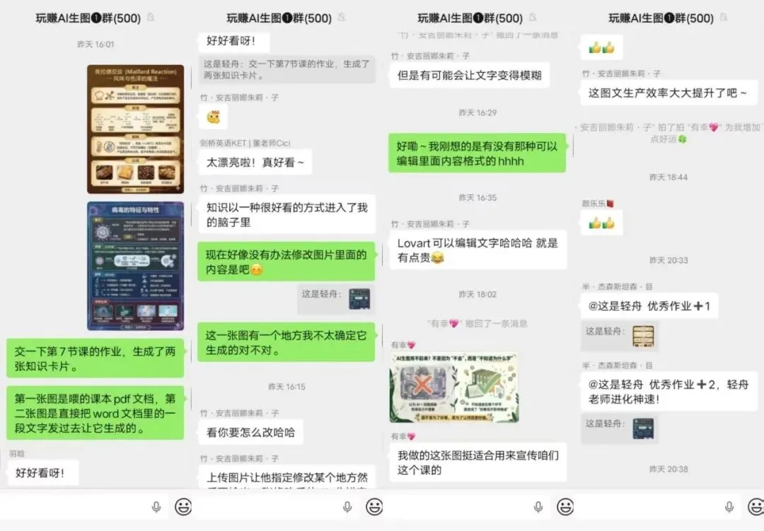 我把这些问题发在同行者陪伴群,还有玩赚AI生图陪伴群里,无论是老师还是同学们都给到了我相应的解答,真的非常感谢大家,同时也能够看出来,无论是老师还是我们的同学,对于这一块的经验都非常足!