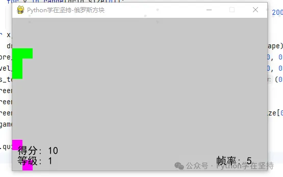 import pygameimport random# 游戏参数grid_size = (15, 25) # 宽 * 高block_size = 20 # 调小方块大小colors = [(255, 0, 0), (0, 255, 0), (0, 0, 255), (255, 255, 0), (0, 255, 255), (255, 0, 255), (255, 100, 0)]# 方块形状和颜色shapes = [ [[0, 0], [0, 1], [0, 2], [0, 3]], # 红色 [[0, 0], [0, 1], [0, 2], [1, 0]], # 绿色 [[0, 1], [0, 0], [0, 2], [1, 1]], # 蓝色 [[0, 2], [0, 1], [0, 0], [1, 2]], # 黄色 [[0, 0], [0, 1], [1, 0], [1, 1]], # 青色 [[0, 1], [0, 0], [1, 1], [1, 2]], # 紫色 [[0, 1], [0, 2], [1, 0], [1, 1]] # 橙色]# 游戏状态game_status = {"Ready": 0, "Gaming": 1, "GameOver": 2}def new_shape(): return random.choice(shapes)def draw_grid(screen, x, y, color): pygame.draw.rect(screen, color, (x * block_size, y * block_size, block_size, block_size))def check_collision(shape, grid, dx, dy): for x, y in shape: if x + dx < 0 or x + dx >= grid_size[1] or y + dy < 0 or y + dy >= grid_size[0] or grid[x + dx][y + dy]: return True return Falsedef remove_completed_lines(grid): lines_cleared = 0 for i in range(grid_size[0]): if all(grid[j][i] != 0 for j in range(grid_size[1])): for j in range(i, 0, -1): for k in range(grid_size[1]): grid[k][j] = grid[k][j - 1] grid[0] = [0] * grid_size[1] # 将顶部空出来作为新的空行 lines_cleared += 1 # 检查横向相邻方块是否可以消除 for i in range(grid_size[0]): for j in range(grid_size[1] - 1): if grid[j][i] != 0 and grid[j][i] == grid[j + 1][i]: grid[j][i] = 0 grid[j + 1][i] = 0 lines_cleared += 1 return lines_cleareddef main(): pygame.init() screen = pygame.display.set_mode((grid_size[1] * block_size, grid_size[0] * block_size)) pygame.display.set_caption("Python学在坚持-俄罗斯方块") clock = pygame.time.Clock() grid = [[0] * grid_size[0] for _ in range(grid_size[1])] current_shape = new_shape() next_shape = new_shape() dx, dy = 0, 0 score = 0 level = 1 game_over = False font = pygame.font.SysFont('SimHei', 20) frame_rate = 5 # 帧率初始值 frames_per_level = 5 # 每升一级增加的帧数 while not game_over: clock.tick(frame_rate) # 设置帧率 for event in pygame.event.get(): if event.type == pygame.QUIT: game_over = True elif event.type == pygame.KEYDOWN: if event.key == pygame.K_LEFT and not check_collision(current_shape, grid, dx - 1, dy): dx -= 1 elif event.key == pygame.K_RIGHT and not check_collision(current_shape, grid, dx + 1, dy): dx += 1 elif event.key == pygame.K_DOWN and not check_collision(current_shape, grid, dx, dy + 1): dy += 1 elif event.key == pygame.K_UP: rotated_shape = [(-y, x) for x, y in current_shape] if not check_collision(rotated_shape, grid, dx, dy): current_shape = rotated_shape if not check_collision(current_shape, grid, dx, dy + 1): dy += 1 else: for x, y in current_shape: grid[x + dx][y + dy] = shapes.index(current_shape) + 1 lines_cleared = remove_completed_lines(grid) if lines_cleared > 0: score += 10 * lines_cleared level = score // 100 + 1 # 每得100分升一级 # 等级提升时增加帧率 if level % frames_per_level == 0: frame_rate += 5 current_shape = next_shape next_shape = new_shape() dx, dy = 0, 0 if check_collision(current_shape, grid, dx, dy): # 当新方块无法放置时,游戏结束 game_over = True screen.fill((255, 255, 255)) for x in range(grid_size[1]): for y in range(grid_size[0]): color = colors[grid[x][y] - 1] if grid[x][y] != 0 else (200, 200, 200) draw_grid(screen, x, y, color) for x, y in current_shape: draw_grid(screen, x + dx, y + dy, colors[shapes.index(current_shape)]) score_text = font.render(f"得分: {score}", True, (0, 0, 0)) level_text = font.render(f"等级: {level}", True, (0, 0, 0)) fps_text = font.render(f"帧率: {frame_rate}", True, (0, 0, 0)) screen.blit(score_text, (10, grid_size[0] * block_size - 50)) screen.blit(level_text, (10, grid_size[0] * block_size - 30)) screen.blit(fps_text, (grid_size[1] * block_size - 100, grid_size[0] * block_size - 30)) pygame.display.flip() pygame.quit()if __name__ == '__main__': main()