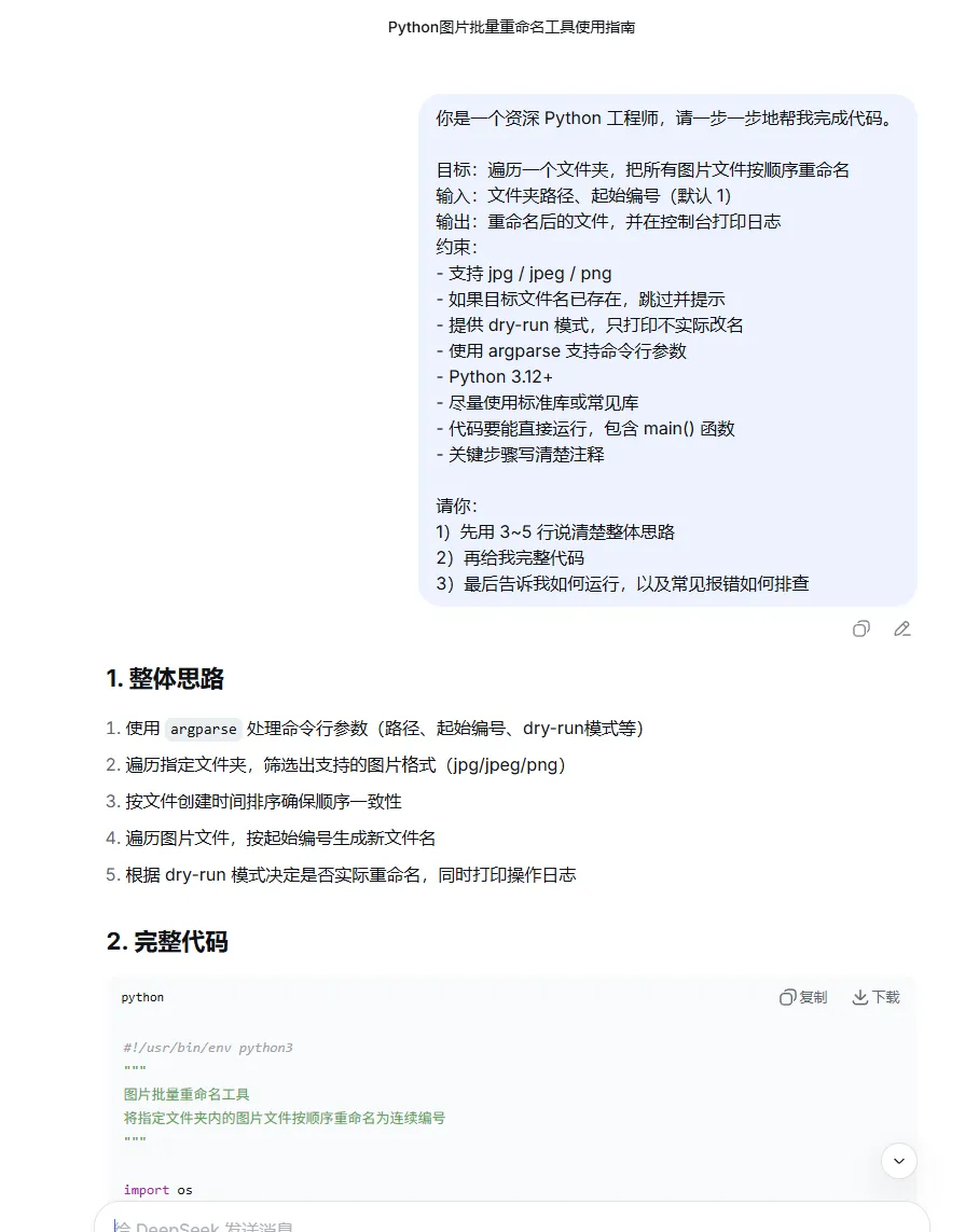 3️⃣ 第一课实战:让 DeepSeek 写一个「批量重命名图片」脚本