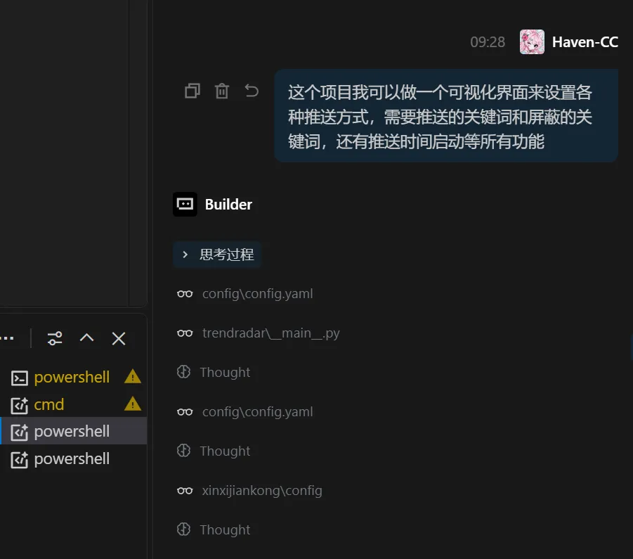 但是, 作为一个纯后端项目,它的所有操作——修改关键词、设置推送时间、填入邮箱密码——全都要在黑漆漆的命令行(Terminal)里完成,甚至还要去改 YAML 配置文件。