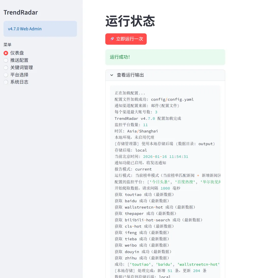 - 现在: 仪表盘上一个硕大的"🚀 立即运行"按钮,点它!下面还能实时看到"正在抓取微博热搜..."的日志。