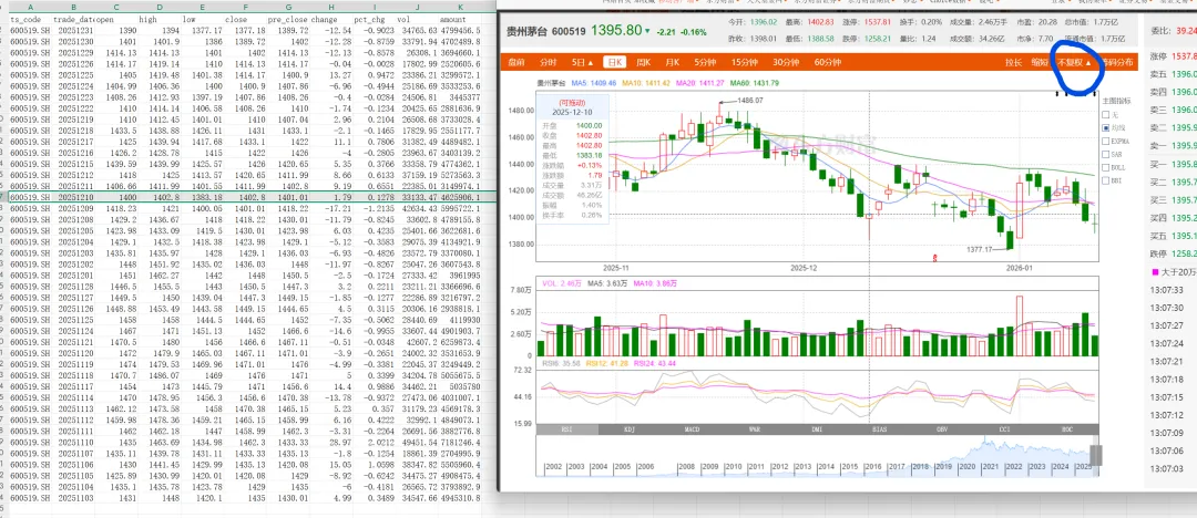 import tushare as ts# https://tushare.pro/ 注册有tokents.set_token('这里填写你的token')pro = ts.pro_api()# 获取股票数据df = pro.daily(ts_code='600519.SH', start_date='20251101', end_date='20251231')csv_file = 'guizhou_maotai_daily_20251101_20251231.csv'df.to_csv(csv_file, index=False)print("数据已保存到csv文件中")