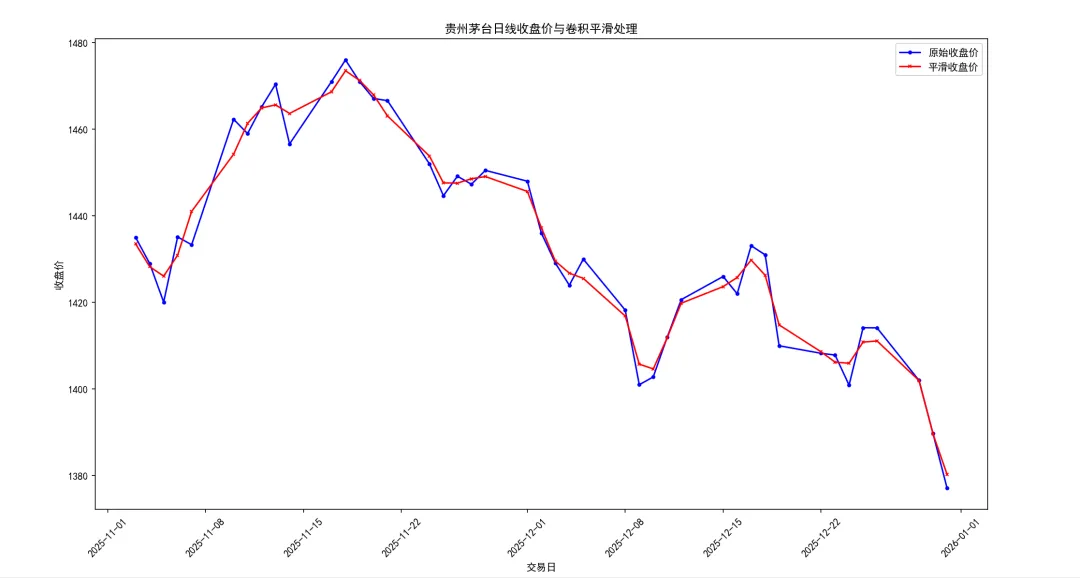 csv_file = 'guizhou_maotai_daily_20251101_20251231.csv'df = pd.read_csv(csv_file)# 定义一个高斯核函数,用于平滑kernel = np.array([0.25, 0.5, 0.25])# 使用高斯核平滑数据df['Smoothed_Close'] = convolve1d(df['close'], kernel)plt.figure(figsize=(10, 6))df['trade_date'] = pd.to_datetime(df['trade_date'],format='%Y%m%d')plt.plot(df['trade_date'], df['close'], label='原始收盘价',color='blue',marker='o', markersize=3)plt.plot(df['trade_date'], df['Smoothed_Close'], label='平滑收盘价',color='red',marker='x', markersize=3)plt.title('贵州茅台日线收盘价与卷积平滑处理')plt.xticks(rotation=45)plt.xlabel('交易日')plt.ylabel('收盘价')plt.legend()plt.show()