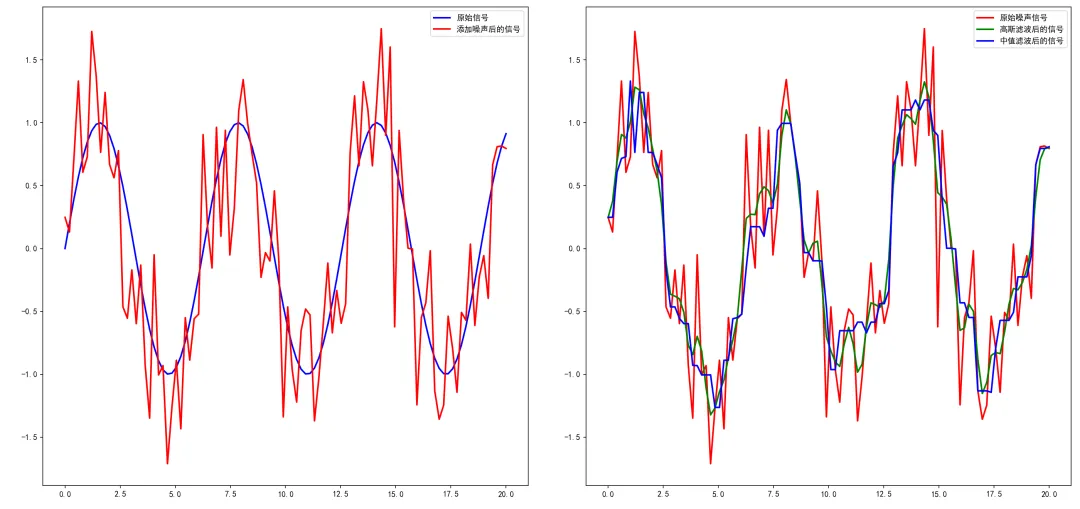 整个代码也是比较简单,首先使用Pandas的read_scv读取我们开始获取的股价数据文件csv,然后定义一个简单的高斯核函数用于平滑处理,该核函数通过赋予中心数据点更大的权重来实现平滑效果,对相邻数据点的权重影响相对较小。然后使用scipy.ndimage中的convolve1d函数对收盘价列进行卷积操作,平滑后的数据被存储在新列df['Smoothed_Close'] 中,卷积操作通过滑动核函数对相邻数据进行加权平均,减少了数据中的噪声或短期波动。最后就是用Matplotlib进行可视化,分别绘制原始收盘价和平滑处理后的收盘价,设置不同的颜色和标记点,清楚地展示了数据的对比效果。在去噪算法中,微积分通过计算信号的导数,可以识别出信号的变化趋势和异常波动,从而实现去噪目的。具体来说,微积分可以通过平滑或过滤信号来减少噪声的影响,以便真实信号更清晰地呈现。微积分不仅可以分析信号的变化,还能识别和处理噪声,在实际应用中,常用的去噪方法包括高斯滤波和中值滤波。其中:G(x,y)是高斯核,表示在点(x,y)处的高斯函数值。σ是标准差,控制着高斯函数的宽度和形状,对平滑程度有直接影响。高斯滤波:基于高斯函数的线性平滑方法,其基本思想是用高斯函数加权邻域像素得到新的像素值。高斯滤波在空间域和频域中均可以实现,通常用于减少图像或信号中的高频噪声。中值滤波:一种非线性去噪方法,它通过取邻域像素的中值来替代中心像素的值。这种方法对脉冲噪声(如盐和胡椒噪声)特别有效,因为中值滤波可以有效地去除极端值的影响。(过程:确定窗口大小,选定当前像素的邻域,对邻域内的像素值进行排序,找到中间值,将当前像素值替换为中值)from matplotlib import pyplot as pltimport pandas as pdimport numpy as npimport tushare as tsfrom scipy.ndimage import gaussian_filter,median_filter# 设置中文字体与负号显示plt.rcParams['font.sans-serif'] = ['SimHei']plt.rcParams['axes.unicode_minus'] = False# 数据集:生成一个一维信号并添加噪声np.random.seed(42) # 保证结果的可重复性x = np.linspace(0,20,100)original_signal = np.sin(x) # 原始信号noisy_signal = original_signal + np.random.normal(0,0.5,size=x.shape) # 添加噪声# 高斯滤波sigma = 1 # 高斯核的标准差,控制平滑程度gaussian_smoothed = gaussian_filter(noisy_signal,sigma) # 使用高斯滤波器平滑信号# 中值滤波window_size = 5 # 中值滤波器的窗口大小median_smoothed = median_filter(noisy_signal, size=window_size) # 使用中值滤波器平滑信号# 绘制原始信号、添加噪声后的信号、高斯滤波后的信号和中值滤波后的信号plt.figure(figsize=(10,6))plt.subplot(1,2,1)plt.plot(x,original_signal,label='原始信号',color='blue',linewidth=2)plt.plot(x,noisy_signal,label='添加噪声后的信号',color='red',linewidth=2)plt.legend()plt.subplot(1,2,2)plt.plot(x,noisy_signal,label='原始噪声信号',color='red',linewidth=2)plt.plot(x,gaussian_smoothed,label='高斯滤波后的信号',color='green',linewidth=2)plt.plot(x,median_smoothed,label='中值滤波后的信号',color='blue',linewidth=2)plt.legend()plt.tight_layout()plt.show()