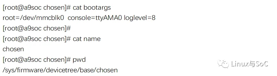 这个结点不描述具体的硬件信息,用于设备树和kernel之间传递信息用,通常传递的是bootargs。在设备树中可以将该节点置空,当然也可以预先定义一些bootargs,然后在kernel的boot阶段填充。例如当前的设备树文件中chosen结点是空的,当kernel启动后去查看chosen结点已经被填充的bootargs。