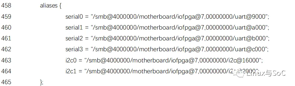 kernel通常是按照绝对路径查询一个设备结点,而aliases将普通的设备结点的label取一个别名,方便后面查看设备。例如vexpress-v2p-ca9.dts文件中将串口和i2c作了别名处理,那么我们在查看dtb的反汇编文件时,别名是按照绝对路径展开的。
