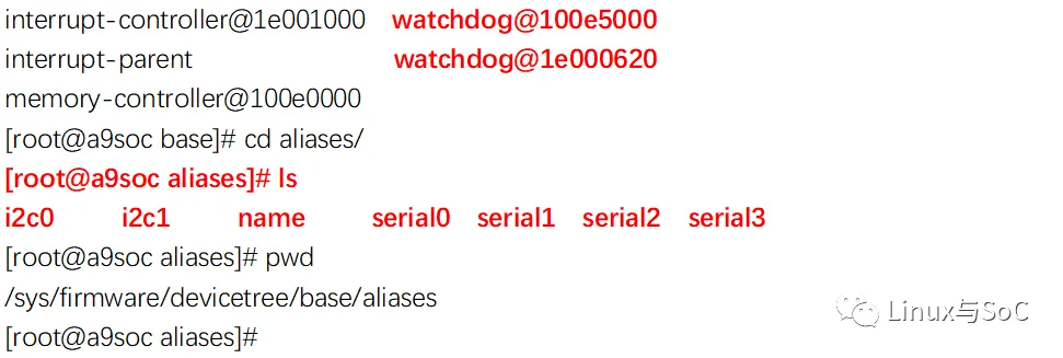 使用了别名的串口、i2c同未使用别名的watchdog对比很明显,可以清楚的知道串口设备的编号。