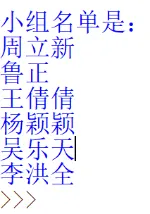 s = input("请输入一段中文:")total = 0for i in s:if i == "。"or i == "?"or i == "!": total += 1print("这段话中共有%d句话" % total)某班“天天向上”小组共有6个同学,姓名和身高数据分别存放在列表a中,编写程序实现小组同学按身高从高到低输出名单,运行结果如图所示: