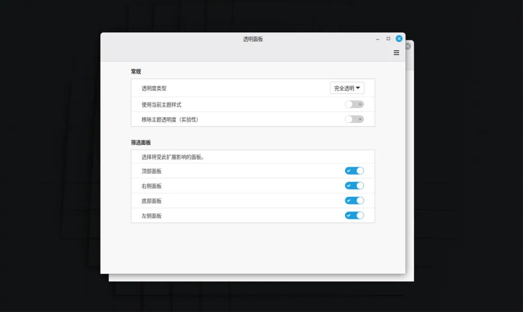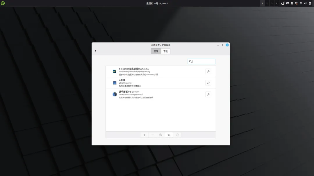 打开“系统设置“ 找到”扩展模块“,在其中找到”透明面板“,”G平铺“,”动态壁纸“下载添加。