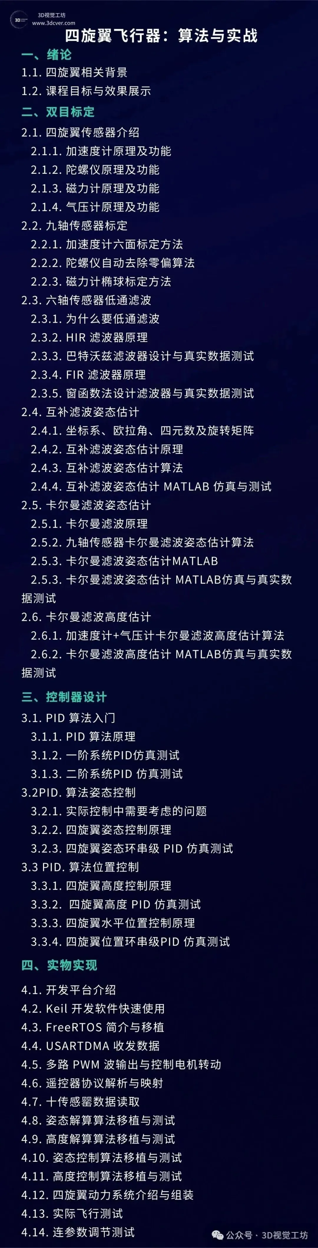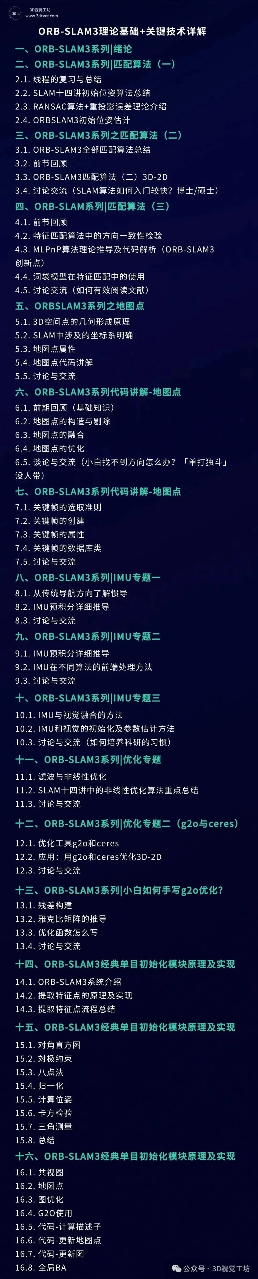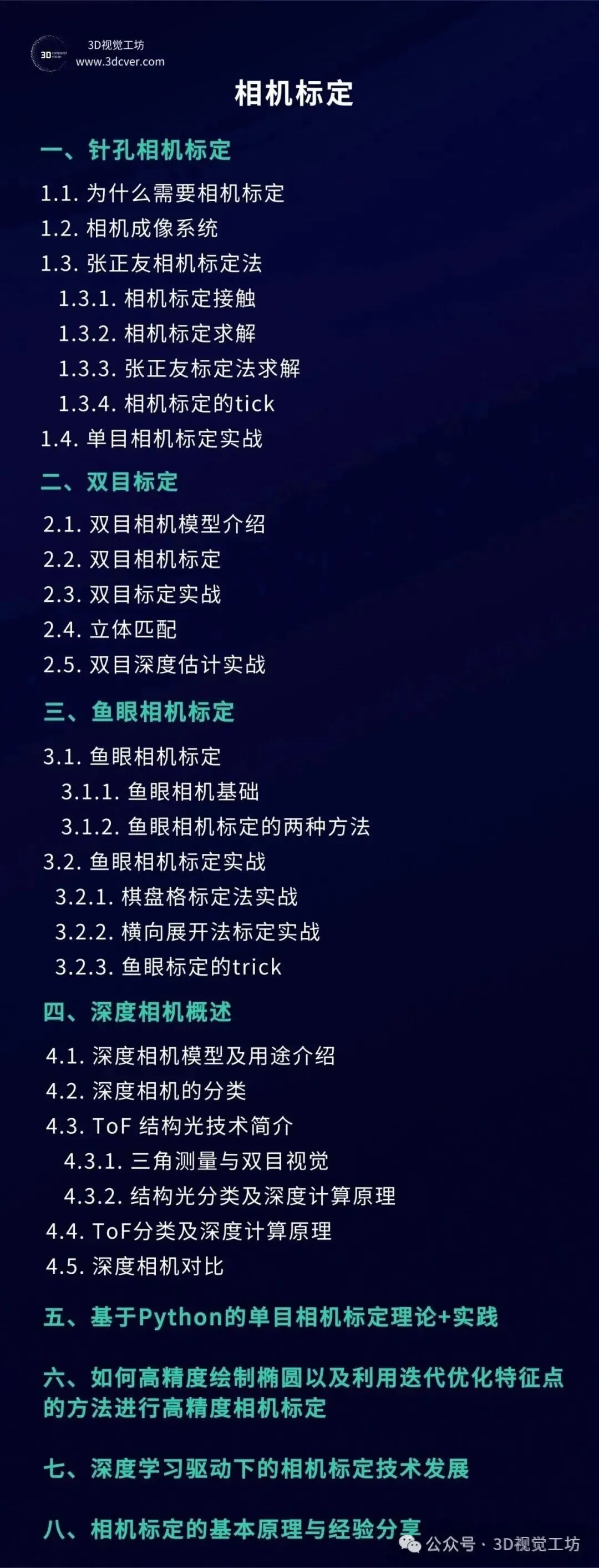 本课程主要包含两部分,分别是相机标定和3D视觉,相机标定包含单目、双目和鱼眼相机标定;3D视觉包含立体视觉、结构光和TOF,以立体视觉为主。课程提供对应数据与代码。