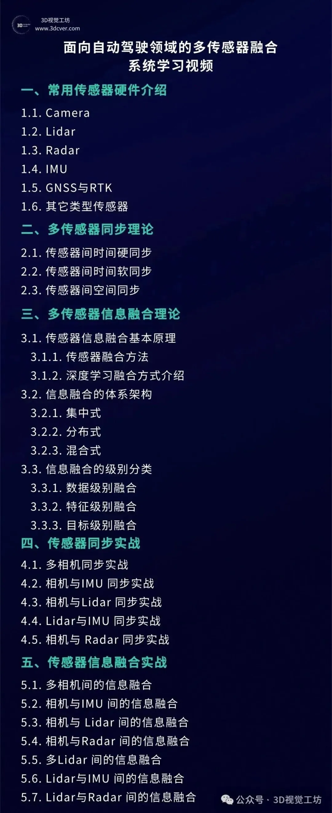 主要分两个大模块:理论篇和实战篇,理论篇部分主要介绍自动驾驶中常用的传感器硬件、传感器间的时间同步和空间同步以及多传感器间的信息融合理论知识;实战篇更多偏向工程应用,工程中传感器间同步与融合如何实现等。
