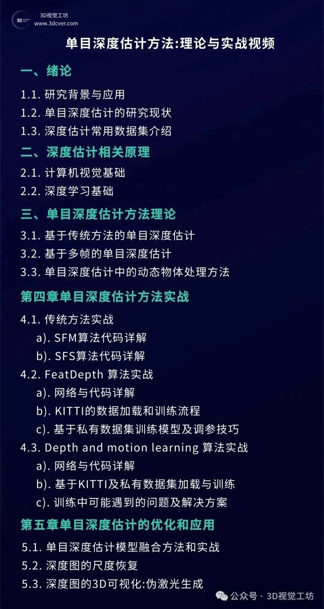 视频教程主要分为两大部分:理论篇和实战篇,由于有监督方法的深度真值获取困难,且无监督方法的效果与有监督方法几乎相当,我们将课程的重心放在了无监督方法上。