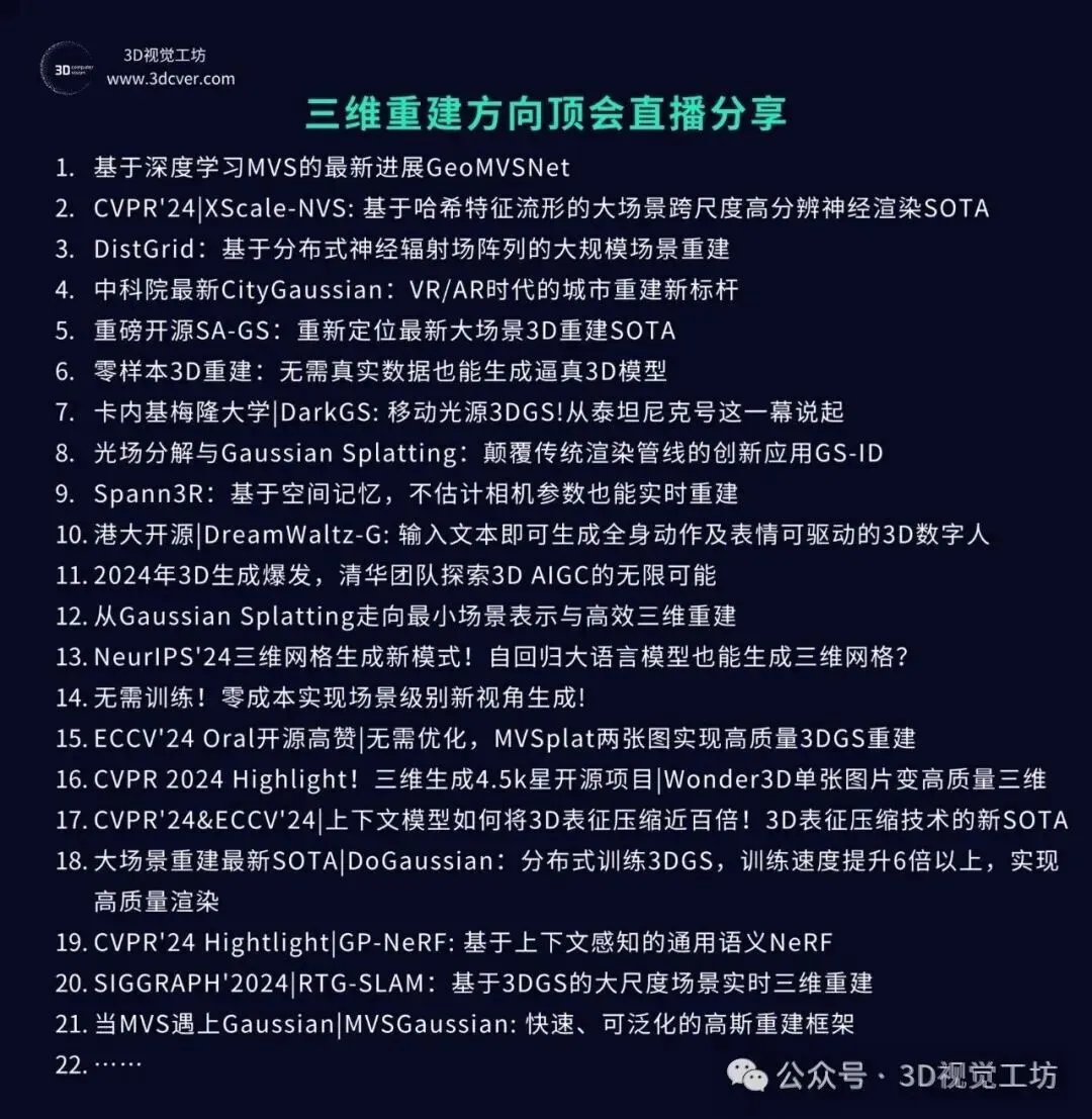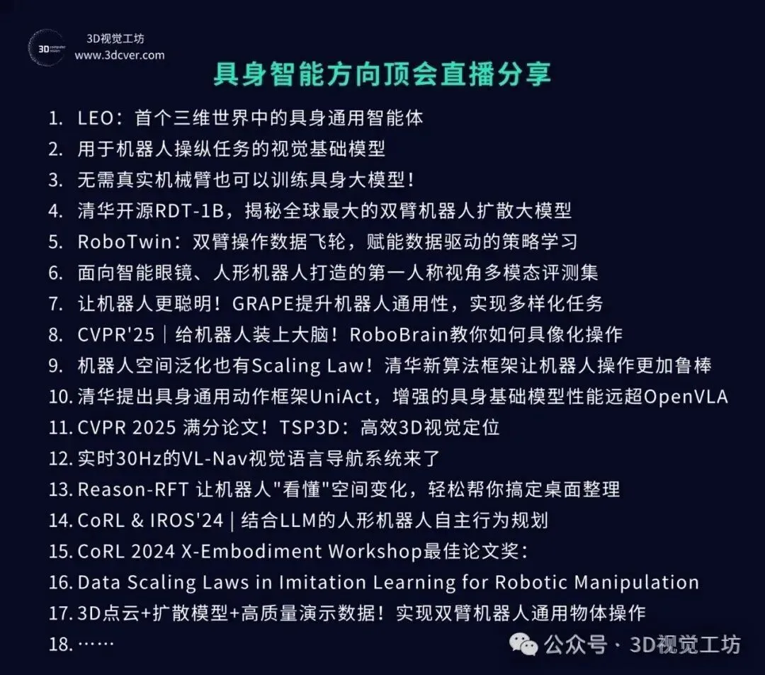 星球内已沉淀近超过100场3D视觉顶会论文直播回放,内容覆盖具身智能、自动驾驶、三维重建、数字人、扩散模型、3D生成等前沿领域。