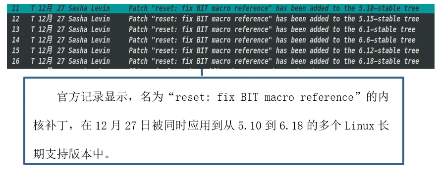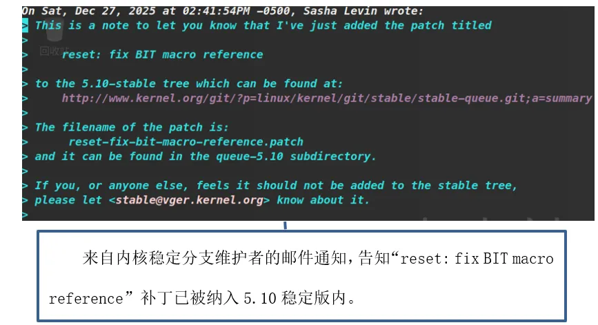 随后,来自内核稳定分支维护者的邮件通知,告知“reset: fix BIT macro reference”补丁已被纳入5.10稳定版内核树。这封邮件是代码被官方采纳的最终证明,其意义堪比一份极具分量的“能力证书”。