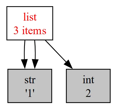 import objgrapha = ['1', 2, '1']objgraph.show_refs([a], filename='sample-graph.pdf')