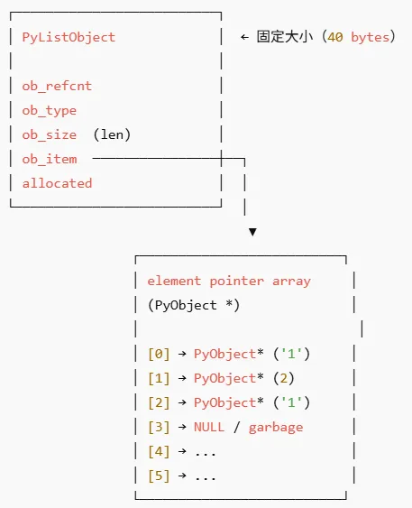 ┌──────────────────────────┐│ PyListObject │ ← 固定大小(40 bytes)│ ││ ob_refcnt ││ ob_type ││ ob_size (len) ││ ob_item ────────────────┼──┐│ allocated │ │└──────────────────────────┘ │ ▼ ┌──────────────────────────┐ │ element pointer array │ │ (PyObject *) │ │ │ │ [0] → PyObject* ('1') │ │ [1] → PyObject* (2) │ │ [2] → PyObject* ('1') │ │ [3] → NULL / garbage │ │ [4] → ... │ │ [5] → ... │ └──────────────────────────┘