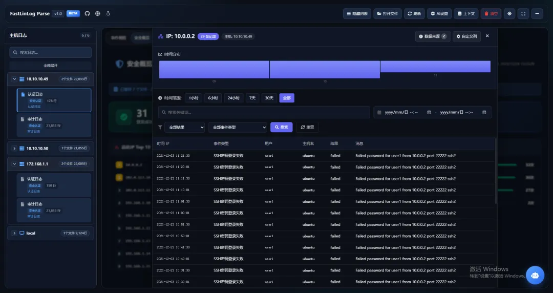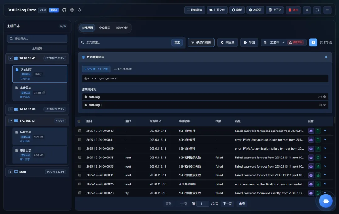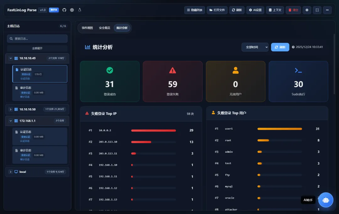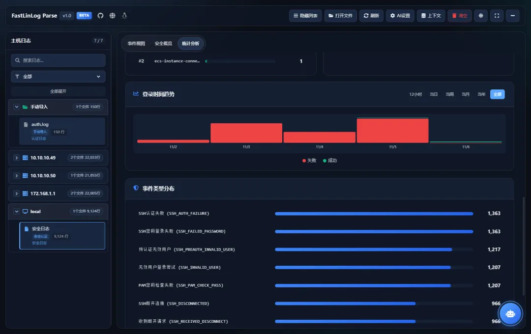 苦Linux日志安全分析久矣?告别 grep/awk/sed 组合拳折磨,安全日志秒级解析,安全风险一键洞察。现在,FastLinLog 一站式解决所有问题!集成AI能力,搭配专属提示词与上下文工程,把复杂的日志分析变成"点一点"的简单操作!