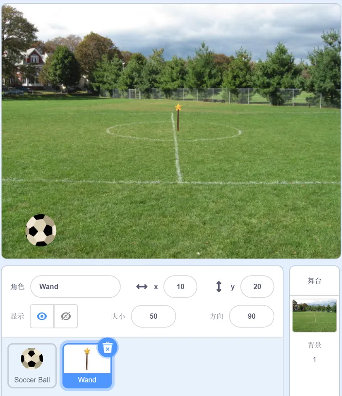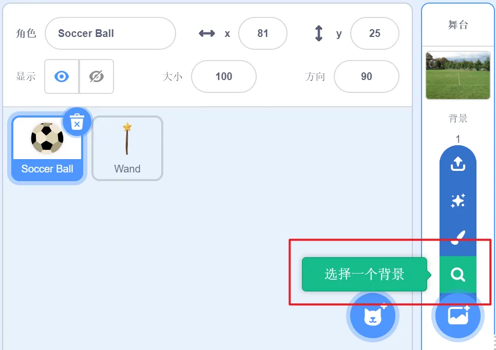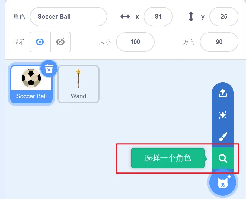 删除默认小猫角色,添加角色Soccer Ball和Wand。
