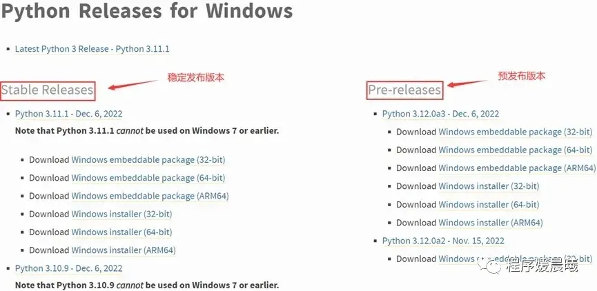 点击进入windows操作系统对应的页面,显示python安装版本,这些python安装版本适合windows操作系统。