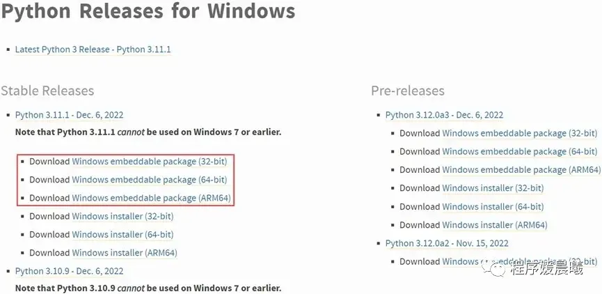 上图中红框中的Windows embeddable package是python的Windows可嵌入包,解压后是一个文件夹,该文件夹是一个最小python运行环境,不包括doc、idle、pip等。该版本主要用于嵌入其他程序之中。