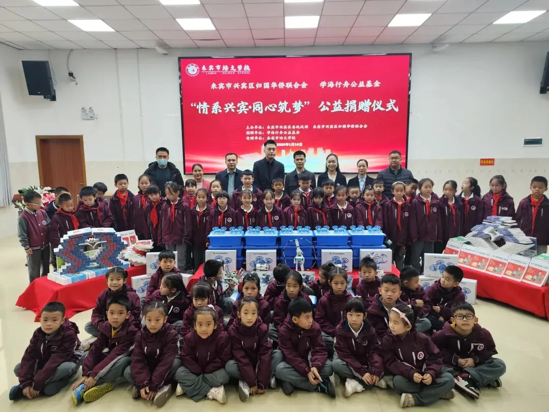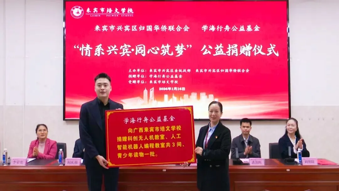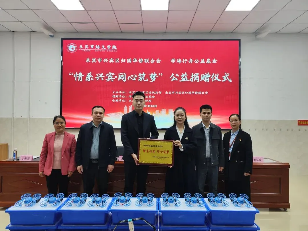 1月16日,来宾市培文学校阶梯教室内暖意融融,“情系兴宾・同心筑梦” 教育公益活动捐赠仪式在此举行。本次活动由兴宾区归国华侨联合会与山东学海行舟公益基金联合发起,以践行教育强国战略、推动教育公平为目标,为基层教育事业发展注入强劲动力,助力城乡教育一体化进程。