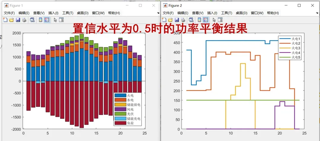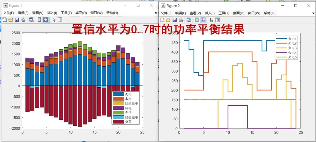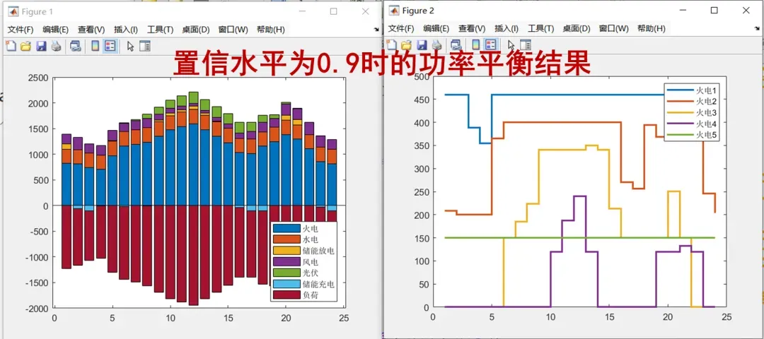 代码实现了一个基于模糊机会约束的电力系统低碳优化调度模型,主要流程如下:首先,代码初始化了系统参数,包括风电(pw)、光伏(pv)和负荷(pload)的时预测数据,火电机组的出力上下限(Pgmin/Pgmax)、爬坡率(rud)、最小启停时间(On_min/Off_min)及成本系数(a,b,c),水电机组容量(Phmin/Phmax),储能系统的容量(capmax)、充放电功率限值(EESmax/EESmin)和效率参数(yita,theta),以及碳交易参数(w,d,tao)。模型引入模糊机会约束处理风光出力和负荷的不确定性,通过梯形模糊数(参数ww,wv,wl)和置信水平alfa=0.9将模糊约束清晰化为线性形式。然后,代码定义了决策变量:火电出力PG、水电出力PH、储能充放电功率x_P_ch/x_P_dis、风光实际出力x_P_w/x_P_v、机组启停状态OnOff等。约束条件包括:1)火电机组物理约束(通过getConsGen1函数实现上下限、爬坡、最小启停时间);2)水电机组出力上下限;3)储能系统约束(通过getConsEES函数实现充放电逻辑、SOC管理);4)风光出力不超过预测值;5)模糊机会约束下的功率平衡(将模糊变量转化为确定线性表达式);6)旋转备用约束;7)火电成本二次项的分段线性化(引入辅助变量gw1-gw5和二进制变量gz1-gz5将非线性项转化为线性混合整数形式)。目标函数包含三部分:火电运行成本(二次函数线性化后计算)、弃风弃光惩罚成本、以及分段碳交易成本(根据实际碳排放与基准的差值划分三个区间,通过二进制变量dd和implies函数实现分段线性化)。最终调用Gurobi求解器对混合整数线性规划(MILP)模型进行优化,得到各机组最优出力计划,并用堆叠柱状图可视化调度结果。该模型通过模糊机会约束处理不确定性,并采用线性化技术高效求解含非线性成本和多类约束的复杂调度问题。