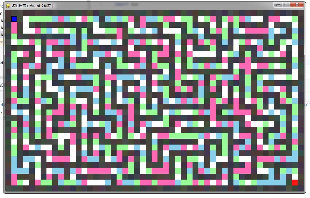 - 运行代码后,迷宫中会出现一个蓝色带黑框的玩家方块,位于左上角起点。