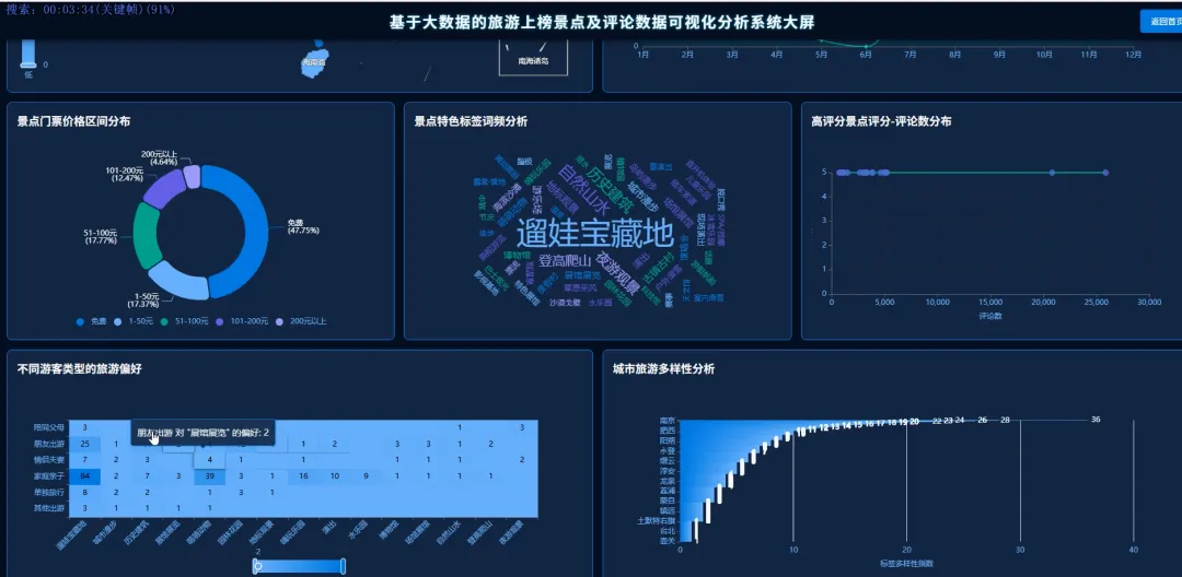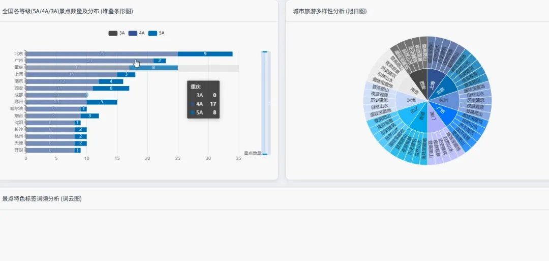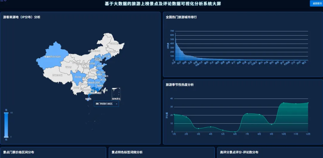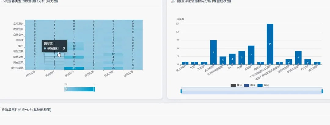 spark = SparkSession.builder.appName("TourismAnalysis").getOrCreate()def analyze_hot_cities(): sight_df = spark.read.csv("hdfs://path/to/sightinfo.csv", header=True, inferSchema=True) # 过滤掉热度分无效的数据,并进行数据清洗 sight_df = sight_df.filter(sight_df["heatscore"].isNotNull() & (sight_df["heatscore"] != "\\N")) # 将热度分转换为数值类型以便计算 from pyspark.sql.functions import col, sum as _sum sight_df = sight_df.withColumn("heatscore", col("heatscore").cast("float")) # 按城市分组并计算总热度 city_heat_df = sight_df.groupBy("districtname").agg(_sum("heatscore").alias("total_heat")) # 按总热度降序排列,获取热门城市排行 hot_cities_df = city_heat_df.orderBy(col("total_heat").desc()) # 将结果写入HDFS或输出 hot_cities_df.coalesce(1).write.csv("hdfs://path/to/output/hot_cities_analysis.csv", header=True, mode="overwrite") return hot_cities_dfdef analyze_tourist_preference(): sight_df = spark.read.csv("hdfs://path/to/sightinfo.csv", header=True, inferSchema=True) comment_df = spark.read.csv("hdfs://path/to/commentinfo.csv", header=True, inferSchema=True) # 定义UDF用于判断评论内容是否包含景点名,解决数据关联难题 from pyspark.sql.functions import udf from pyspark.sql.types import BooleanType def contains_sight_name(plcontent, poiname): if plcontent and poiname: return poiname in plcontent return False contains_udf = udf(contains_sight_name, BooleanType()) # 通过交叉连接和UDF过滤来关联两个数据集(注意:大数据量下此方法效率低,仅为示例逻辑) combined_df = comment_df.crossJoin(sight_df).filter(contains_udf(comment_df["plcontent"], sight_df["poiname"])) # 处理标签字段,拆分并展开 from pyspark.sql.functions import explode, split combined_df = combined_df.withColumn("tag", explode(split(combined_df["tagname"], ","))) # 按游客类型和景点标签分组,统计偏好次数 preference_df = combined_df.groupBy("touristtype", "tag").count() # 将结果写入HDFS preference_df.coalesce(1).write.csv("hdfs://path/to/output/tourist_preference_analysis.csv", header=True, mode="overwrite") return preference_dfdef analyze_comment_sentiment(): comment_df = spark.read.csv("hdfs://path/to/commentinfo.csv", header=True, inferSchema=True) # 过滤掉评分无效的数据 comment_df = comment_df.filter(comment_df["score"].isNotNull() & (comment_df["score"] != "\\N")) # 将评分转换为整数类型 from pyspark.sql.functions import col, when, count as _count comment_df = comment_df.withColumn("score", col("score").cast("int")) # 根据评分定义情感倾向:4-5分为好评,3分为中评,1-2分为差评 sentiment_df = comment_df.withColumn("sentiment", when(col("score") >= 4, "好评") .when(col("score") == 3, "中评") .otherwise("差评")) # 按情感倾向分组,统计各评价的数量 sentiment_count_df = sentiment_df.groupBy("sentiment").agg(_count("*").alias("count")) # 将结果写入HDFS sentiment_count_df.coalesce(1).write.csv("hdfs://path/to/output/comment_sentiment_analysis.csv", header=True, mode="overwrite") return sentiment_count_df