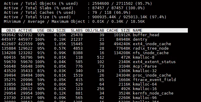 Active / Total Objects (% used) : 2594368 / 2711642 (95.7%) Active / Total Slabs (% used) : 87464 / 87464 (100.0%) Active / Total Caches (% used) : 79 / 118 (66.9%) Active / Total Size (% used) : 900895.88K / 925040.48K (97.4%) Minimum / Average / Maximum Object : 0.01K / 0.34K / 18.56K OBJS ACTIVE USE OBJ SIZE SLABS OBJ/SLAB CACHE SIZE NAME993642 927732 93% 0.10K 25478 39 101912K buffer_head445977 445977 100% 0.19K 21237 21 84948K dentry422607 422559 99% 1.05K 15445 30 494240K ext4_inode_cache135884 129622 95% 0.57K 4853 28 77648K radix_tree_node134208 123202 91% 0.99K 8388 16 134208K nfs_inode_cache