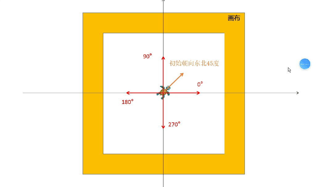 turtle库中有默认的规则,原始坐标原点(0,0)朝右是0°,朝左是180°,朝上90°,朝下270°。如下图所示:
