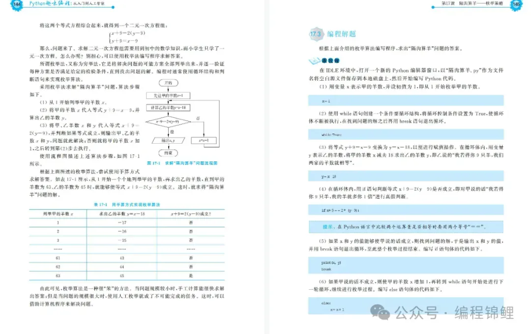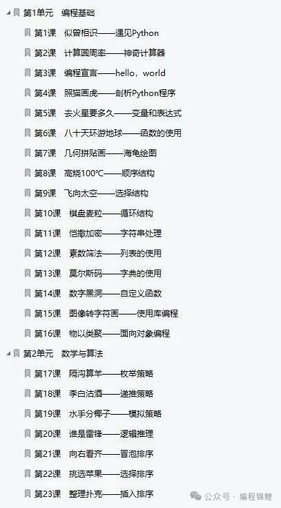 第2单元是数学与算法,安排了11个课程,讲授基本的算法策略、排序和查找算法、分形图和数学曲线的画法。其中,4个课程讲授使用枚举、递推、模拟等算法策略编程解决方程问题、逻辑推理问题等,案例有隔沟算羊、李白沽酒、水手分椰子等;5个课程讲授冒泡排序、选择排序、插入排序、快速排序和二分查找等算法;还有2个课程讲授勾股树分形图的画法和利用参数方程绘制玫瑰曲线图形,在练习题中还介绍谢尔宾斯基三角形和六角星雪花分形图、心形曲线和蝴蝶曲线的画法。